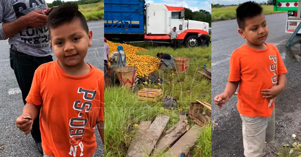 Se hace viral niño que dijo no a la rapiña; intenta comprar naranjas de un camión volcado