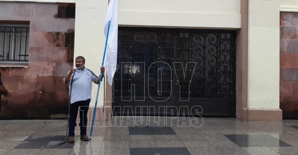 Encadenado, pide liberación de su hijo frente a Palacio de Gobierno en Ciudad Victoria