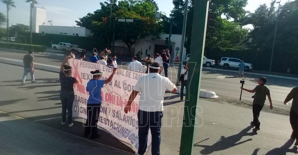 Protestan empleados eventuales de Salud de Tamaulipas frente a la casa de Gobierno