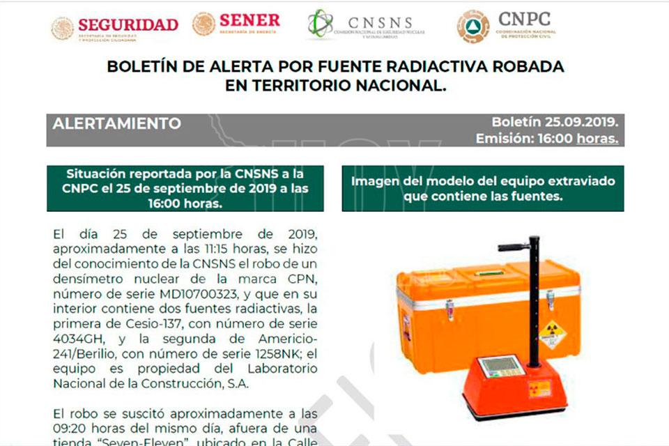 Alerta por robo de fuente radioactiva en Tamaulipas