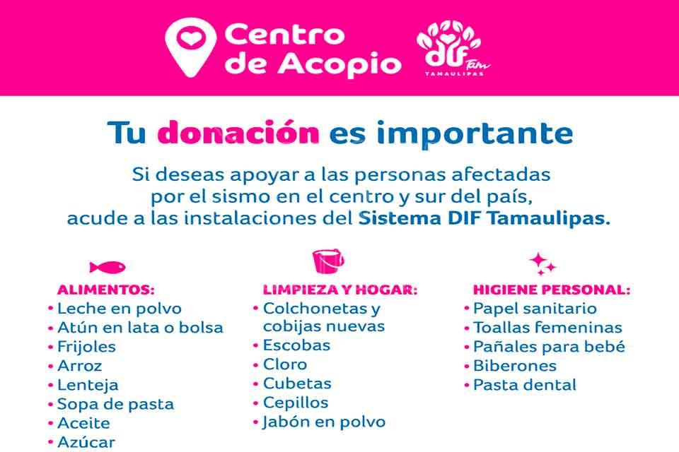 Activa DIF Tamaulipas Centro de Acopio para ayudar a familias del centro del país