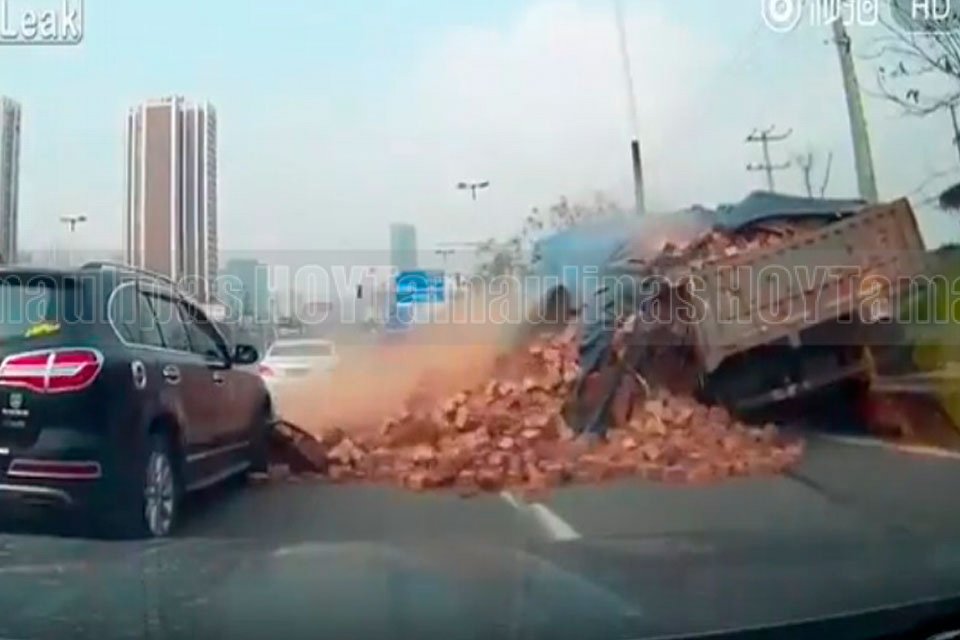 Auto termina aplastado por una carga de ladrillos