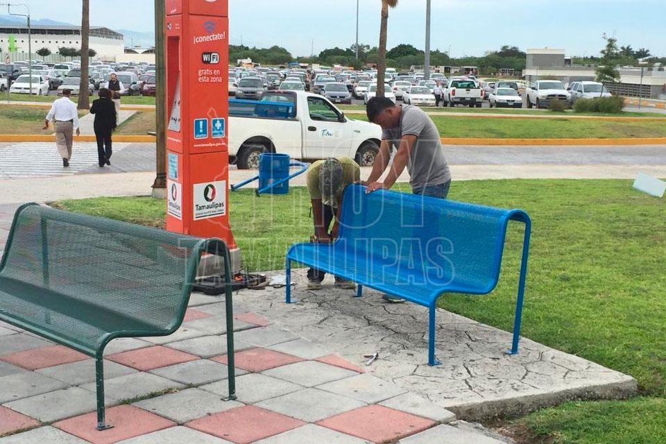 Ponen bancas y cestos de basura azul en Parque Bicentenario de Ciudad Victoria